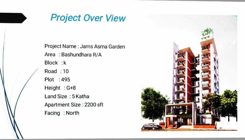 Experience elevated living at Jams Asma Garden, a boutique residential project located on Road 10, K Block, Bashundhara R/A, Dhaka. This exclusive property features single-unit 2200 SFT apartments — perfect for families seeking privacy, space, and a peaceful lifestyle in one of Dhaka’s most prestigious neighborhoods.