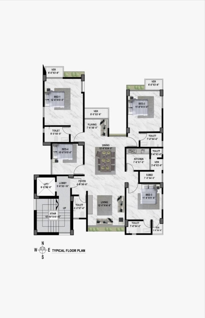 Built on 5 katha of prime land, this G+8 north-facing building ensures excellent light and ventilation throughout the day. With just one apartment per floor, each home offers unmatched exclusivity, featuring 4 spacious bedrooms and 4 modern bathrooms.